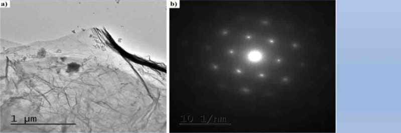 Important NOTE: For a definitive IDENTIFICATION of graphene by TEM, it is necessary to complement the observation with the structural characterisation by obtaining by EDS a characteristic ELECTRON DIFFRACTION PATTERN (as in figure b below). The pattern corresponding to graphite or graphene has hexagonal symmetry, and usually has several concentric hexagons. It has not been possible to obtain this pattern for the moment because of the scarcity of sample available for processing, and the chaotic arrangement and density of the folds.